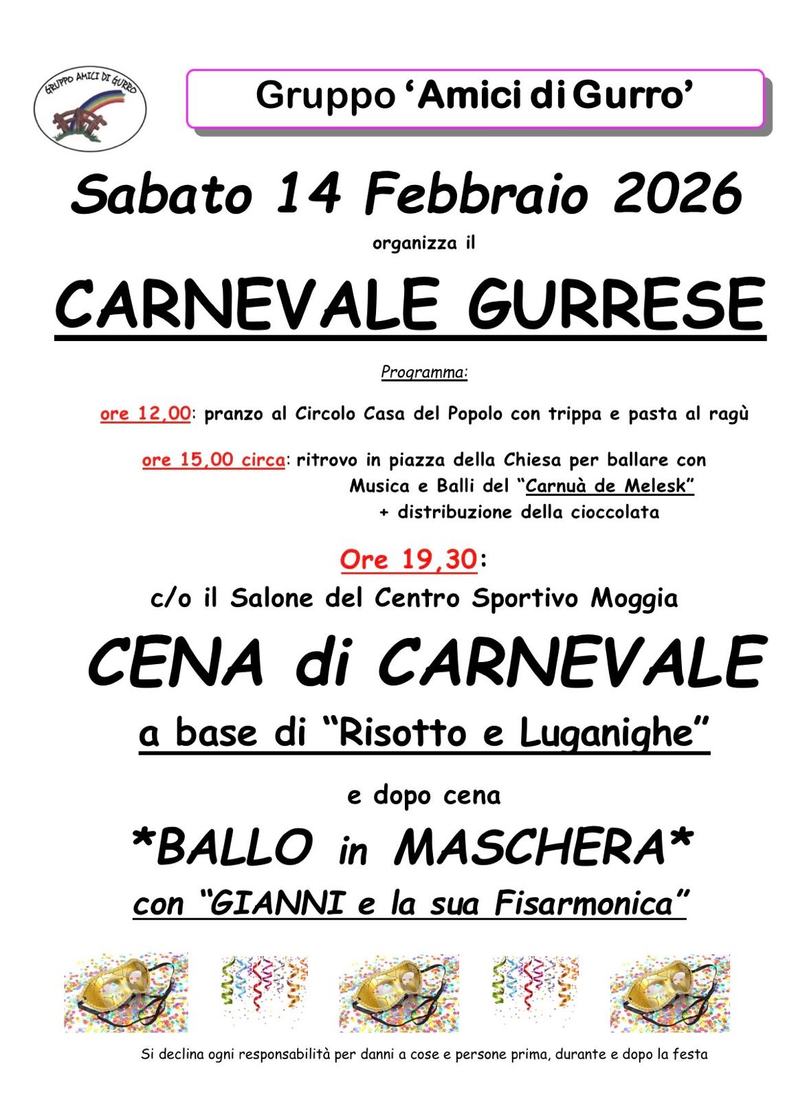 Ore 19:30 presso il Salone del Centro Sportivo Moggia CENA DI CARNEVALE a base di "Risotto e Luganighe" e dopo cena BALLO in MASCHERA con GIANNI e la sua Fisarmonica.