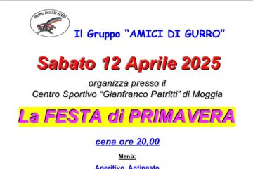 Il Gruppo Amici di Gurro SABATO 12 APRILE 2025 organizza presso il Centro Sportivo "Gianfranco Patritti" di Moggia LA FESTA DI PRIMAVERA cena ore 20.00 Prezzo cena € 30,00